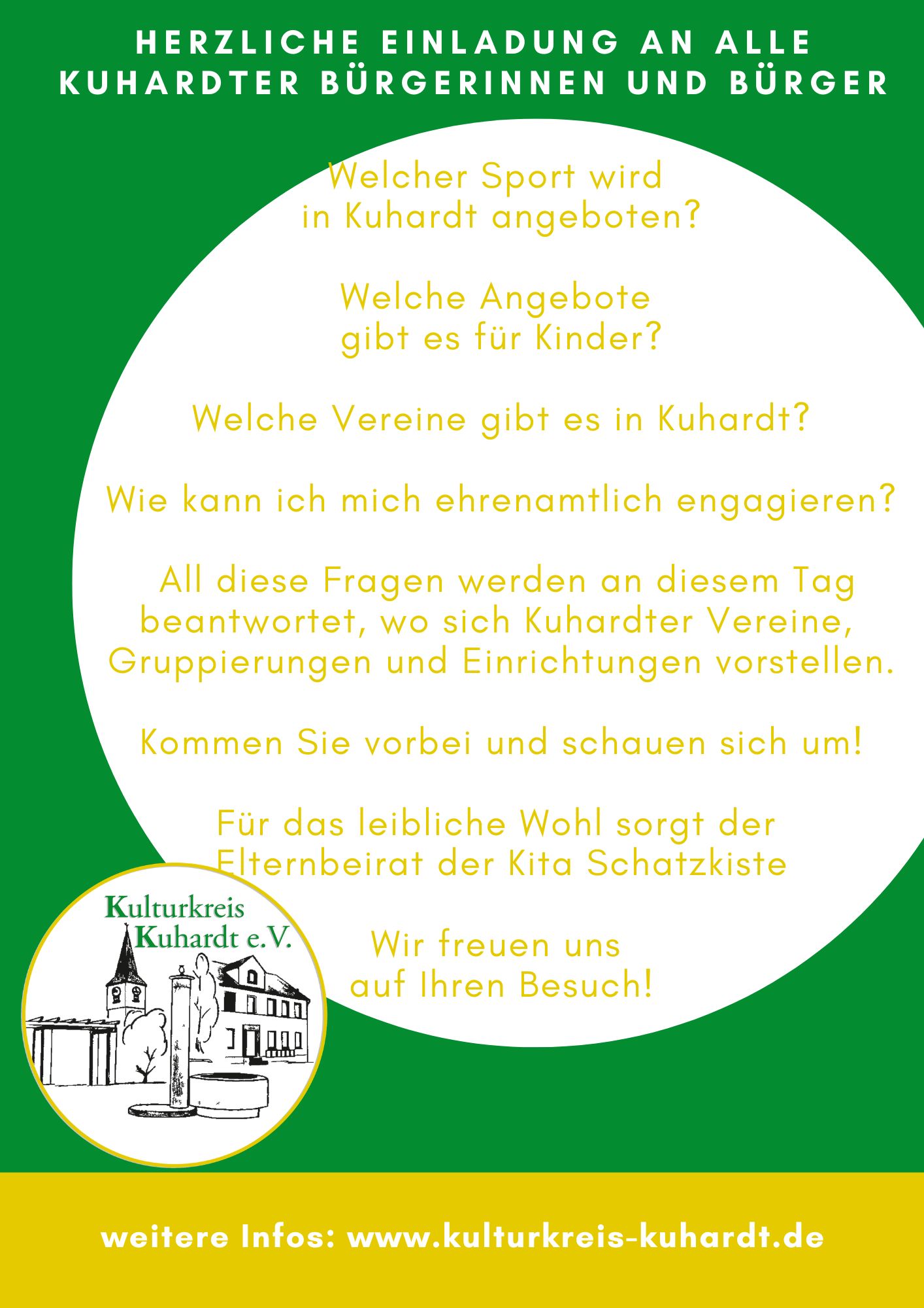 Dazu laden wir die Kuhardter Bevölkerung recht herzlich ein und freuen uns auf einen schönen gemeinsamen Sonntagnachmittag und darauf, zu zeigen, was man in Kuhardt so alles macht und was man machen kann.